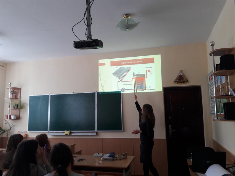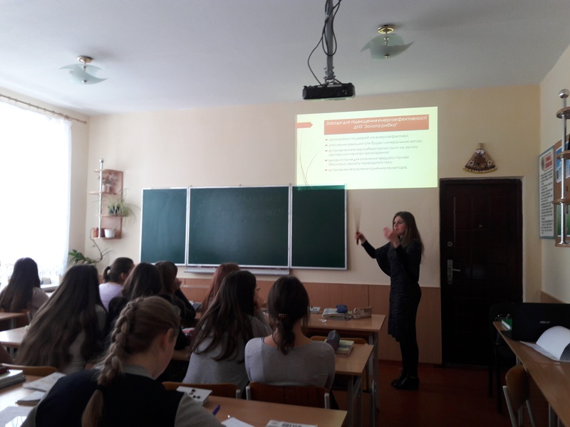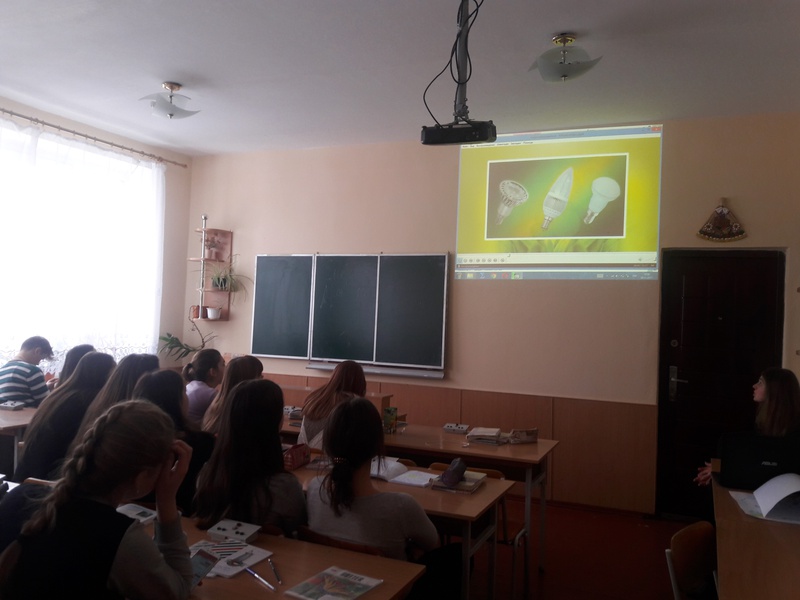 Вчитель фізики, Малачковська Ганна Ярославівна, провела урок в 10-В класі на тему "Енергозбереження". Було наведено приклади економних побутових приладів, що можна використовувати в домі, ефективність використання економних лампочок тощо.